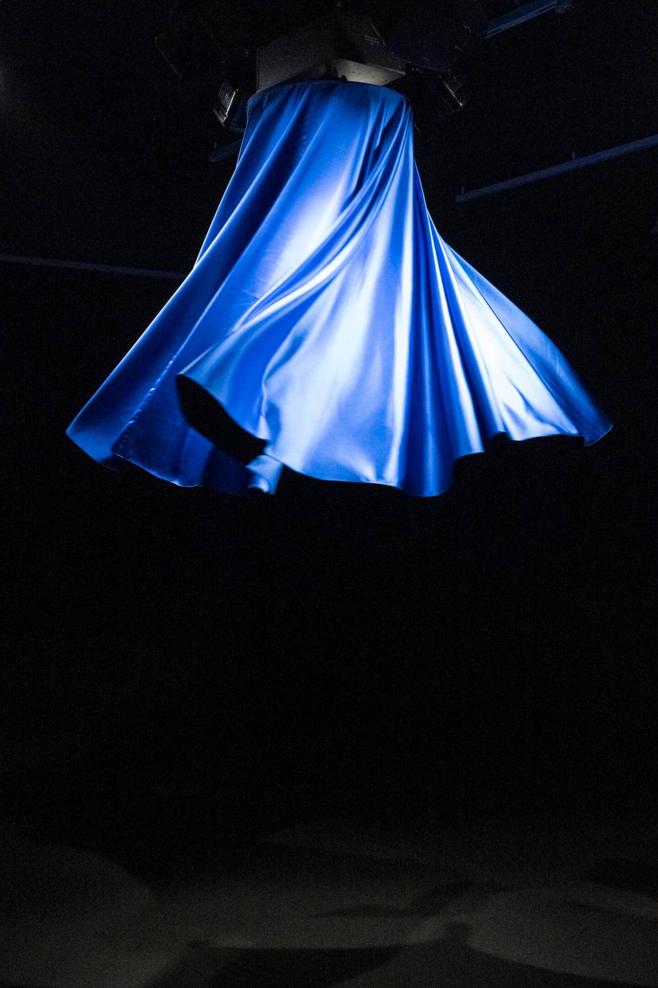 In Catherine Wheel (2026), an illuminated blue skirt spins above the viewer’s head, synchronized with the artist’s uncontrollable laughter. The sound originates from a four-hour tickling session during which Simnett was pushed into an increasingly exhausted and unpredictable state. The resulting laughter – dark, strained, and edged with gallows humour – takes on a possessed, almost satanic quality. The skirt’s relentless movement becomes threatening in its sheer persistence, exerting pressure not only symbolically but bodily, as something that cannot be stopped or escaped.