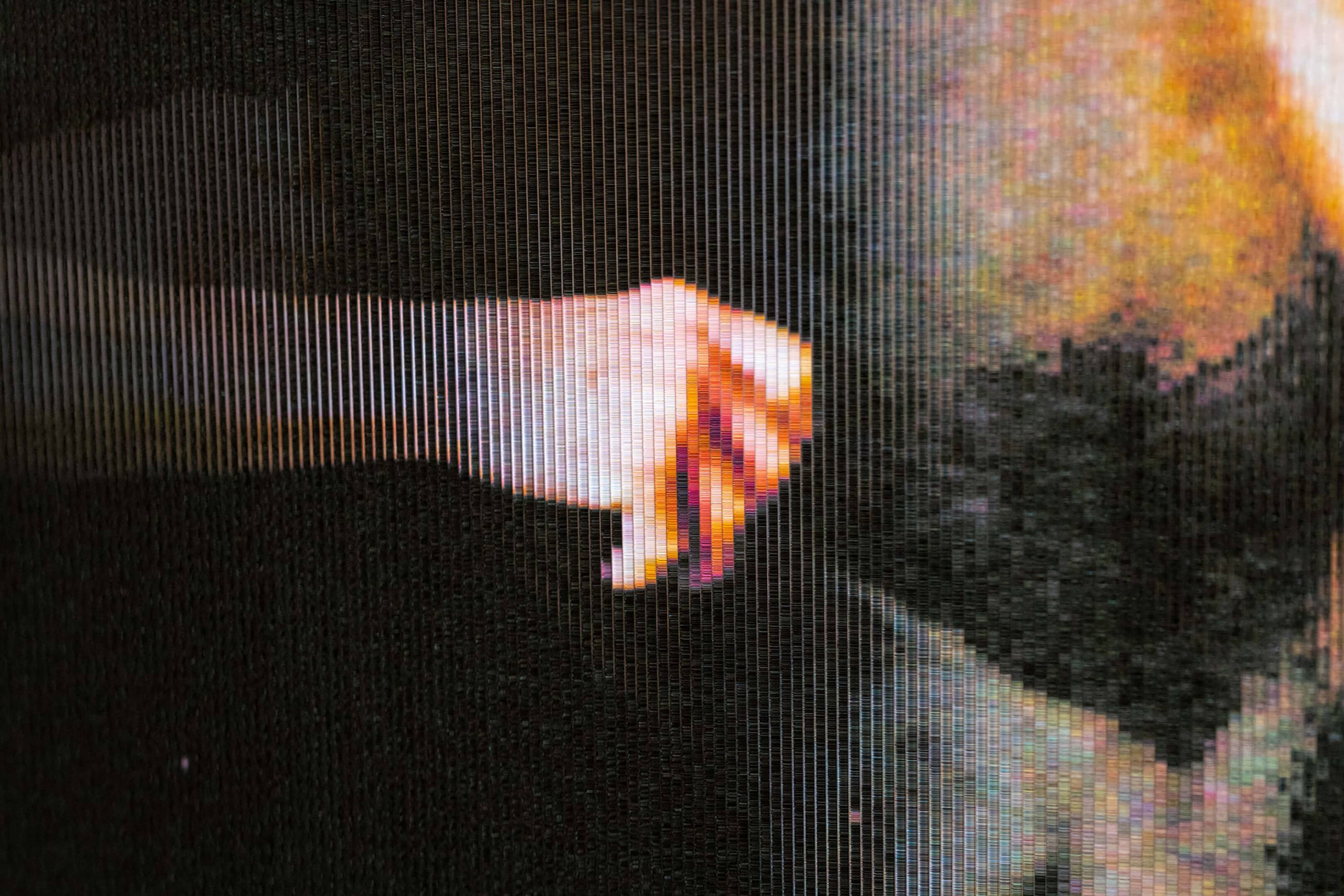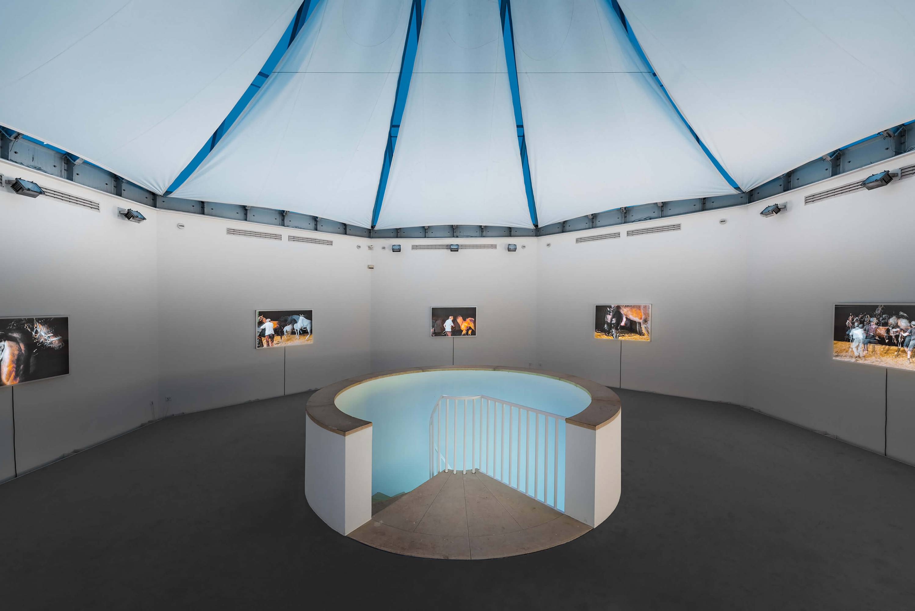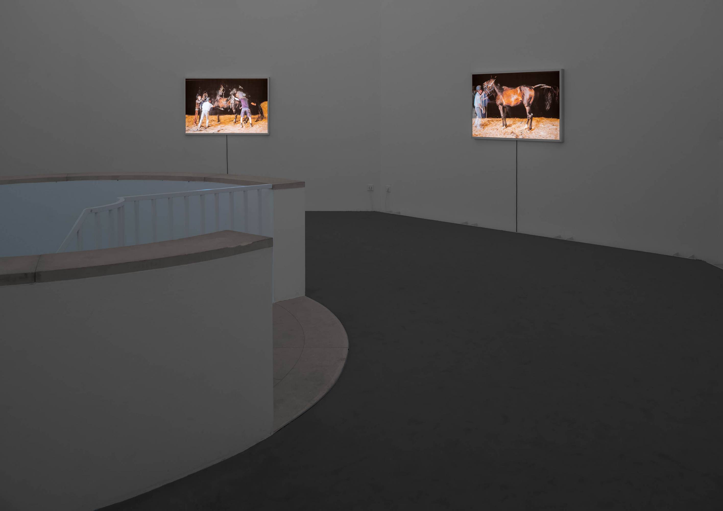 Seven lenticular animations depict mares being “covered” by stallions in a breeding shed. The work depicts behind-the-scenes activities on a stud farm in Worcestershire, England, and the process by which horses are handled in order to breed top class racehorses. Simnett has used lenticular technology to display different covering attempts. The viewers activate the scenes by moving around the octagonal room and as a consequence the act of looking becomes implicated in the act of breeding.