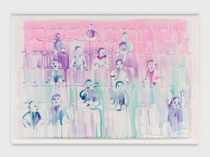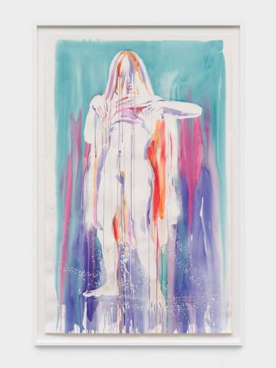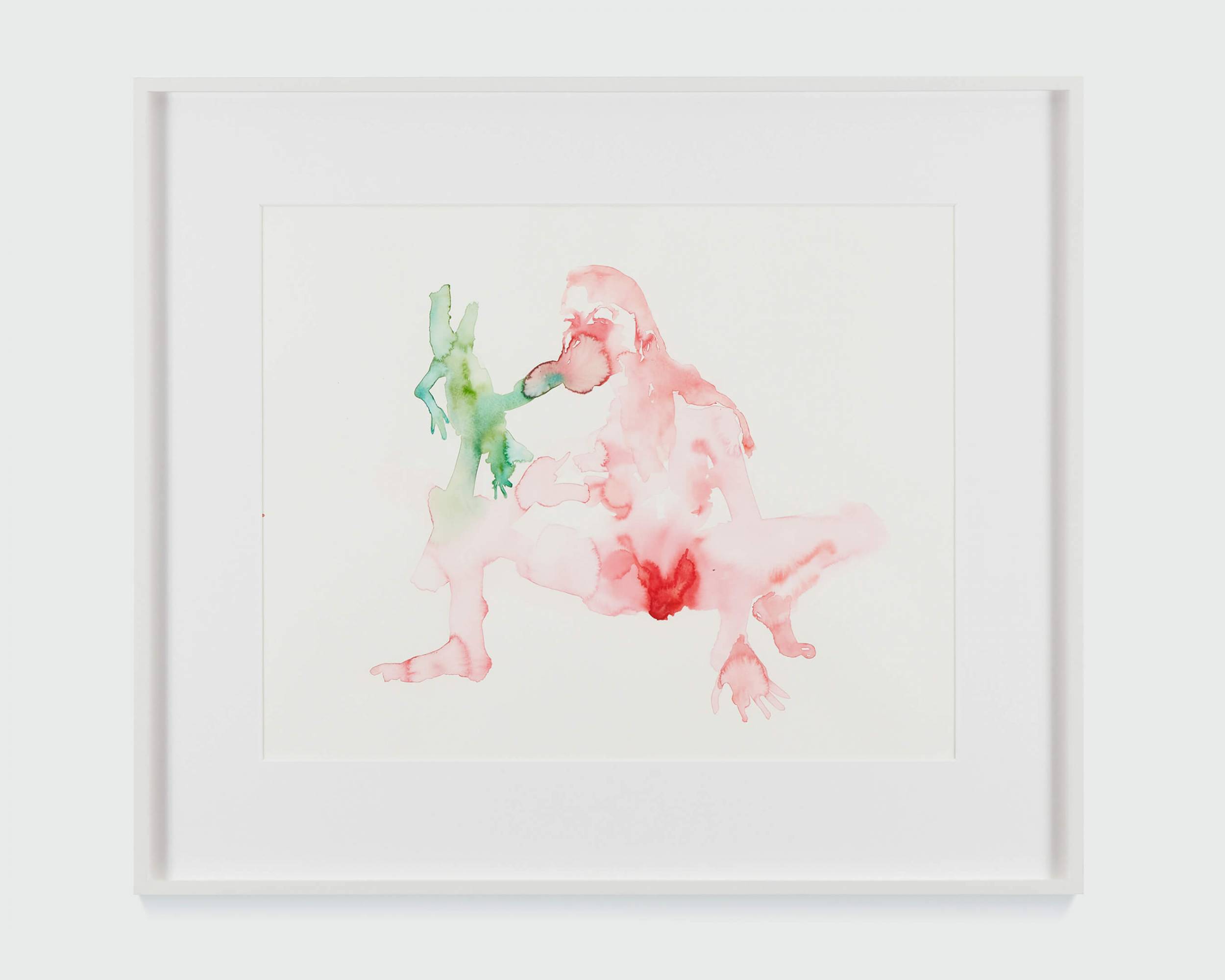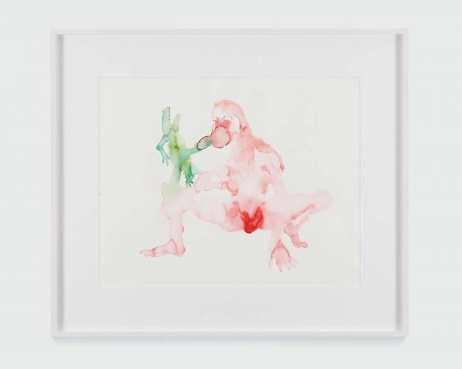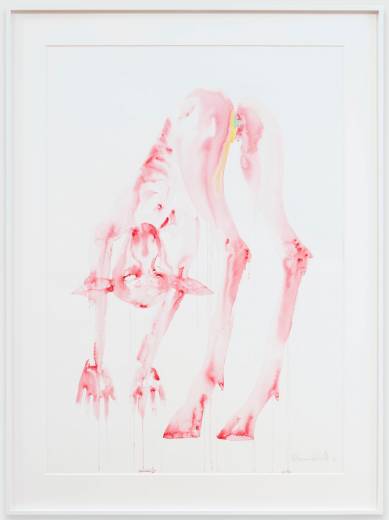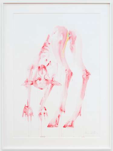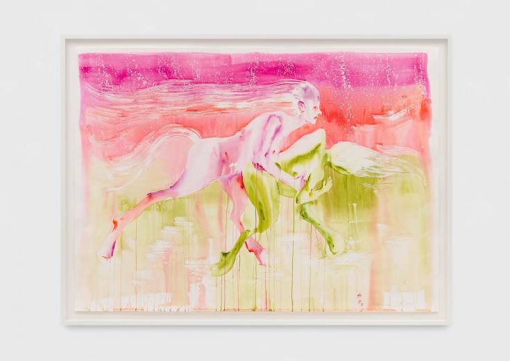 This series explores interspecies love and bestiality, creating emotionally charged constellations that are at once vulnerable, violent, and tender. The bodies are fluid and entangled, the watercolour literally bleeding the forms together. These points of contact between species, rendered in vivid stains of color, gesture towards a mutual transformation.