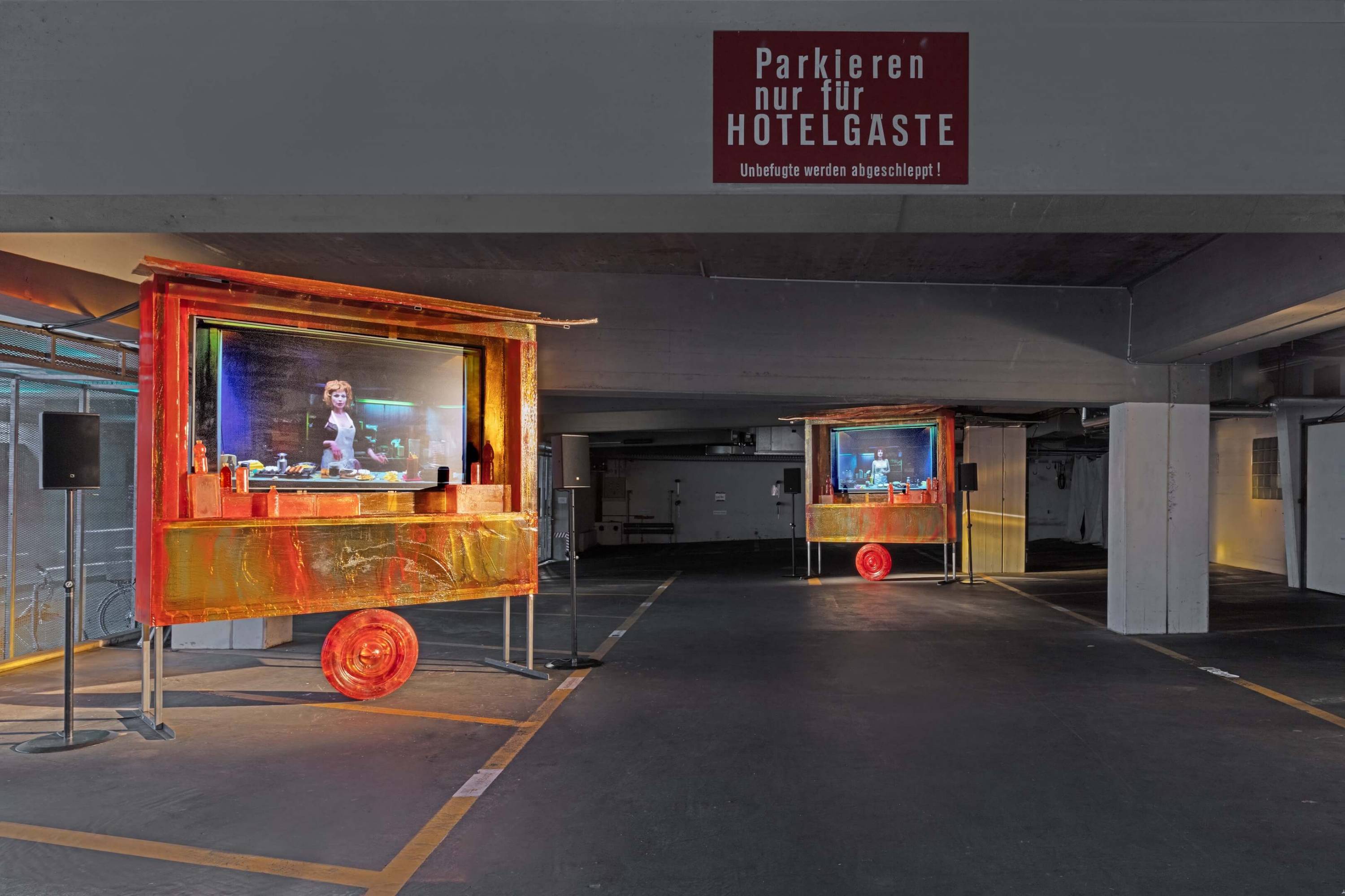 Interlude is an installation consisting of two videos looped within sculptures of concession stands, inspired by those found at sporting events. Rendered in rich ochre, red, and gold tones, the work’s sculptural elements appear illuminated from within by an otherworldly inner glow, giving them a mesmerizing, eerie quality that intensifies when the shutters lift to reveal videos of solitary women singing and preparing food—only to retreat behind the blinds once more.