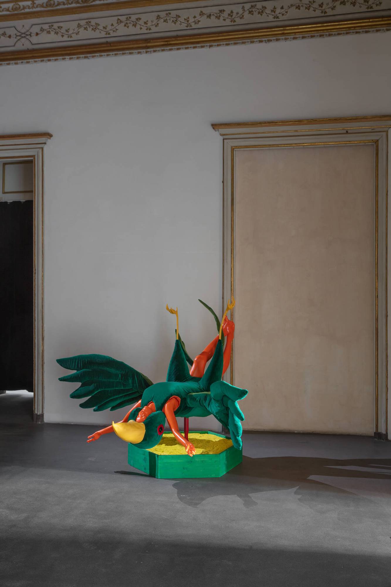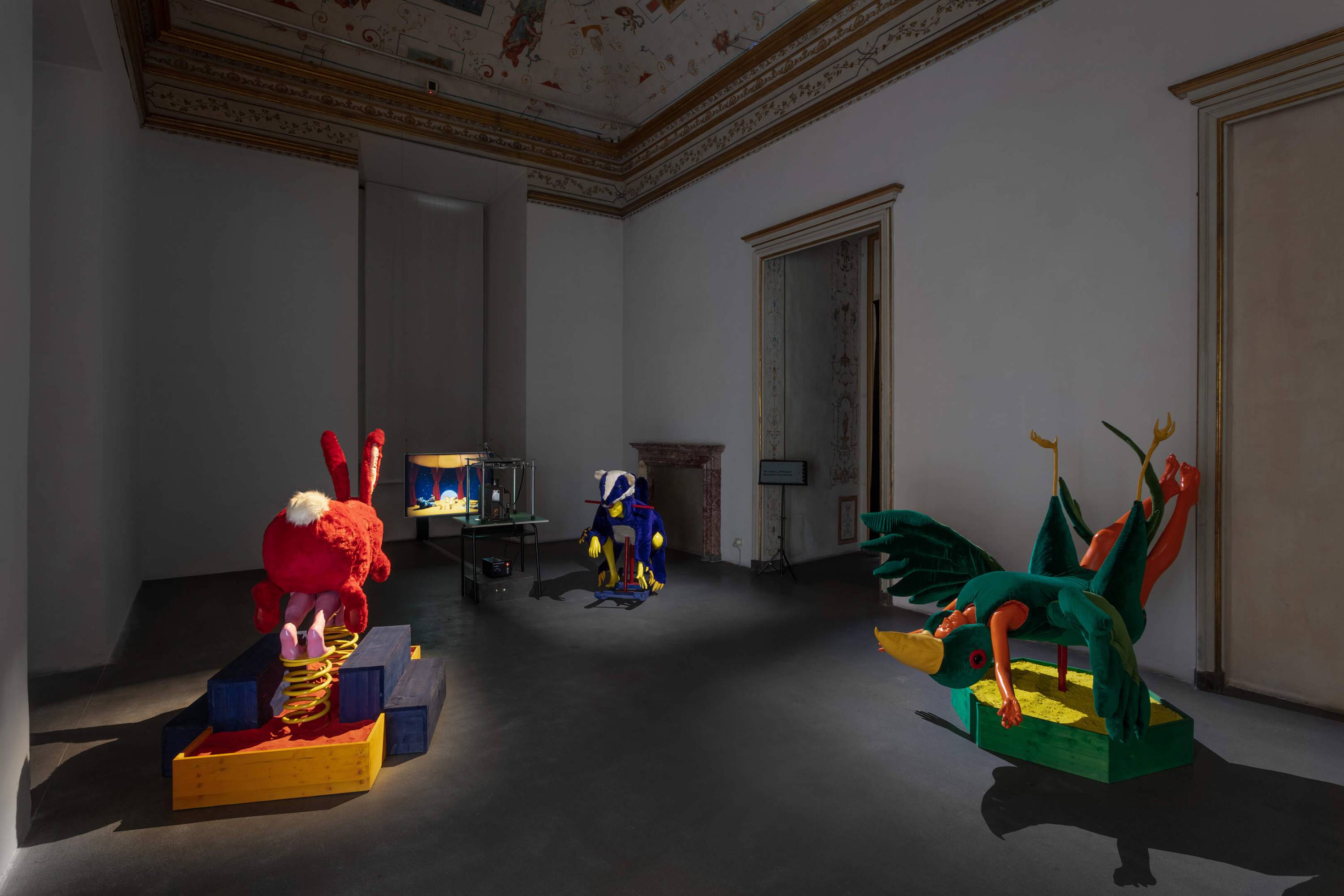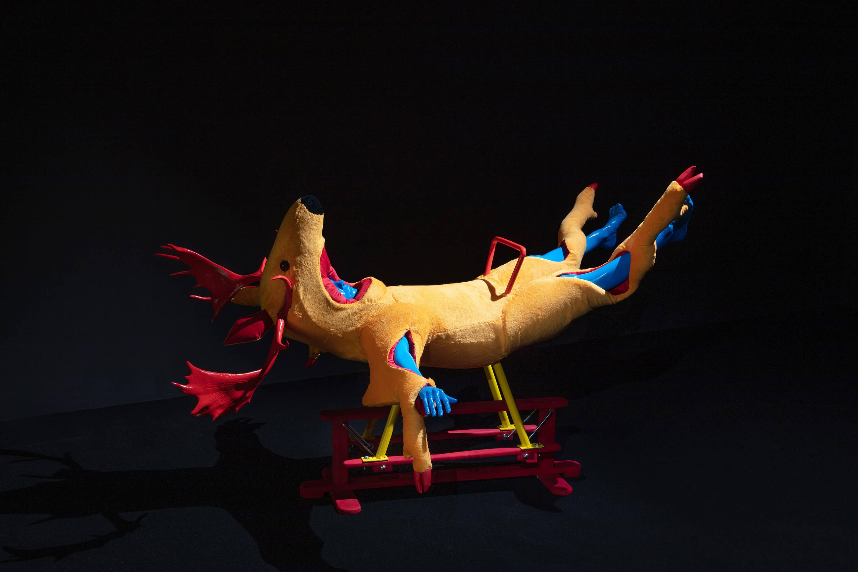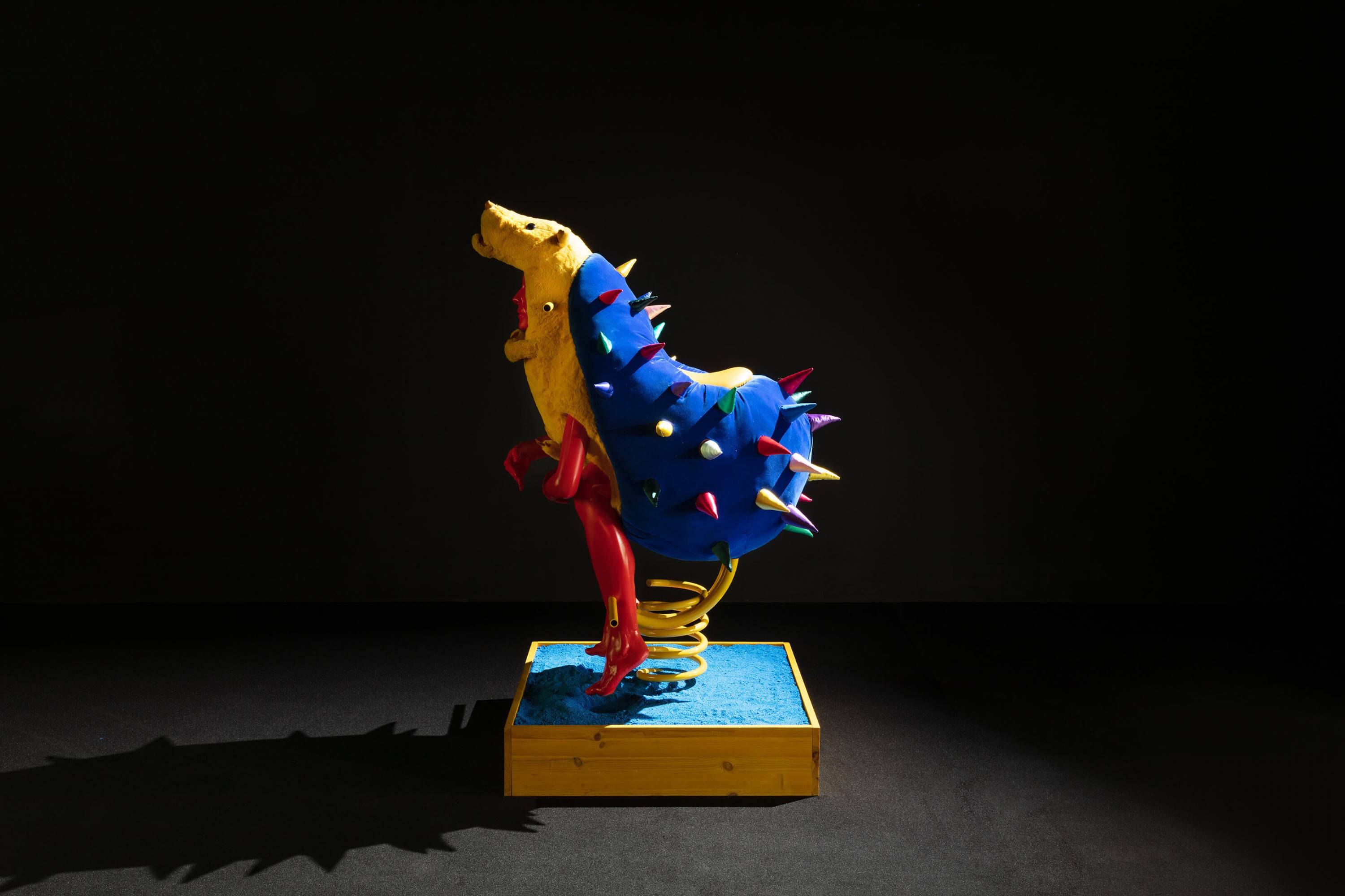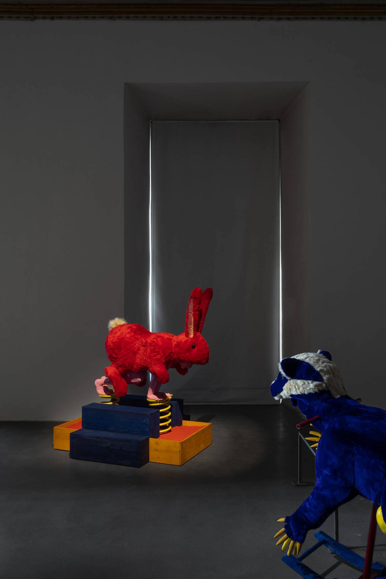 Prayers for Roadkill draws its title from a line in Adrian Piper’s journal where she expresses empathy and fascination with the micro-violence that unfolds beneath the wheels of an automobile. In Simnett’s stop motion animation film and intricate sculptures depicting hybrid human-animal creatures, she wields the aesthetic of vintage children’s television programming, soft play areas, and modernist asylums to explore the emotional and material entanglements of love and cruelty. To create the characters in her film, Simnett not only literally reanimates roadkill but reclaims – and thereby empowers – the image of the animal to plumb the depths of some of the darkest, most fundamental aspects of being human.
