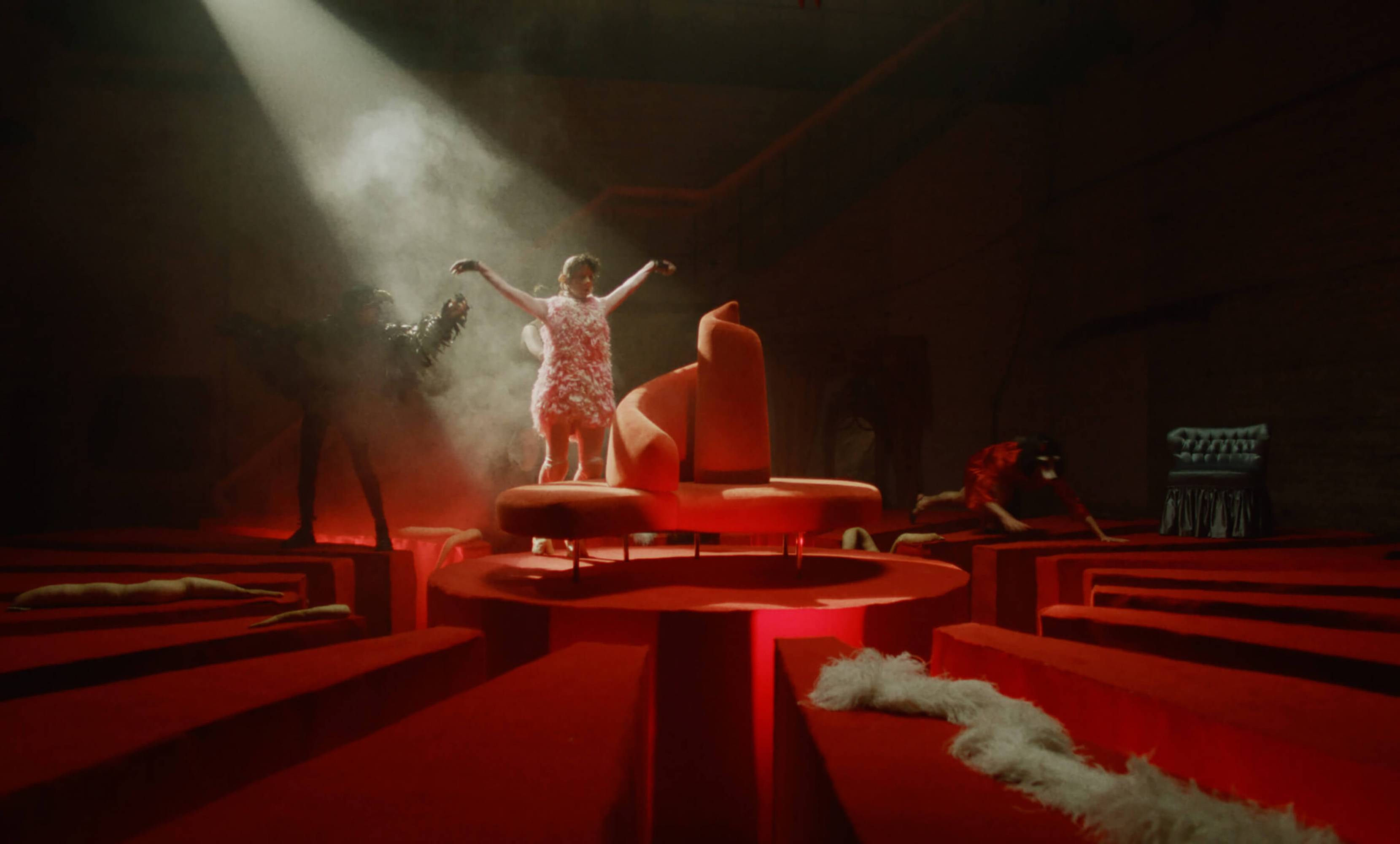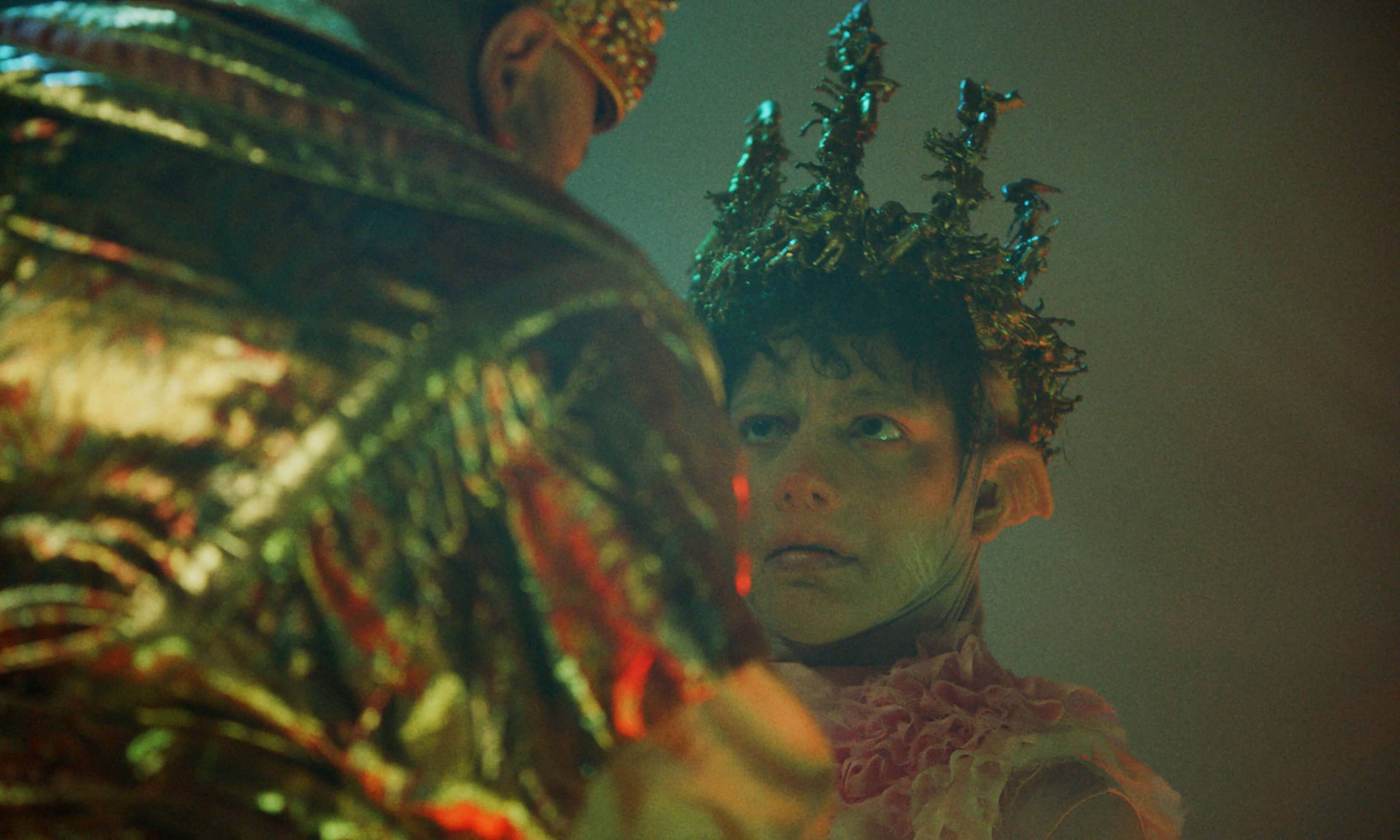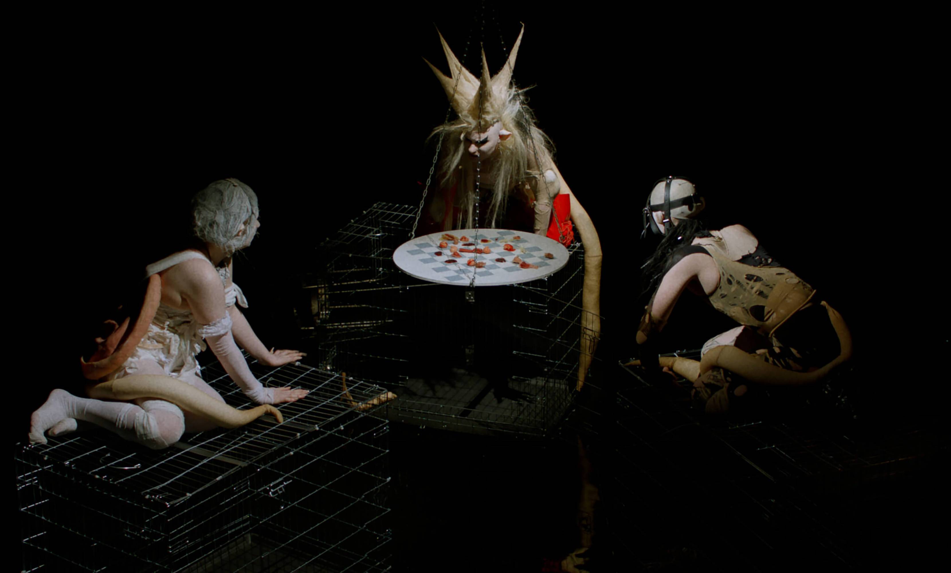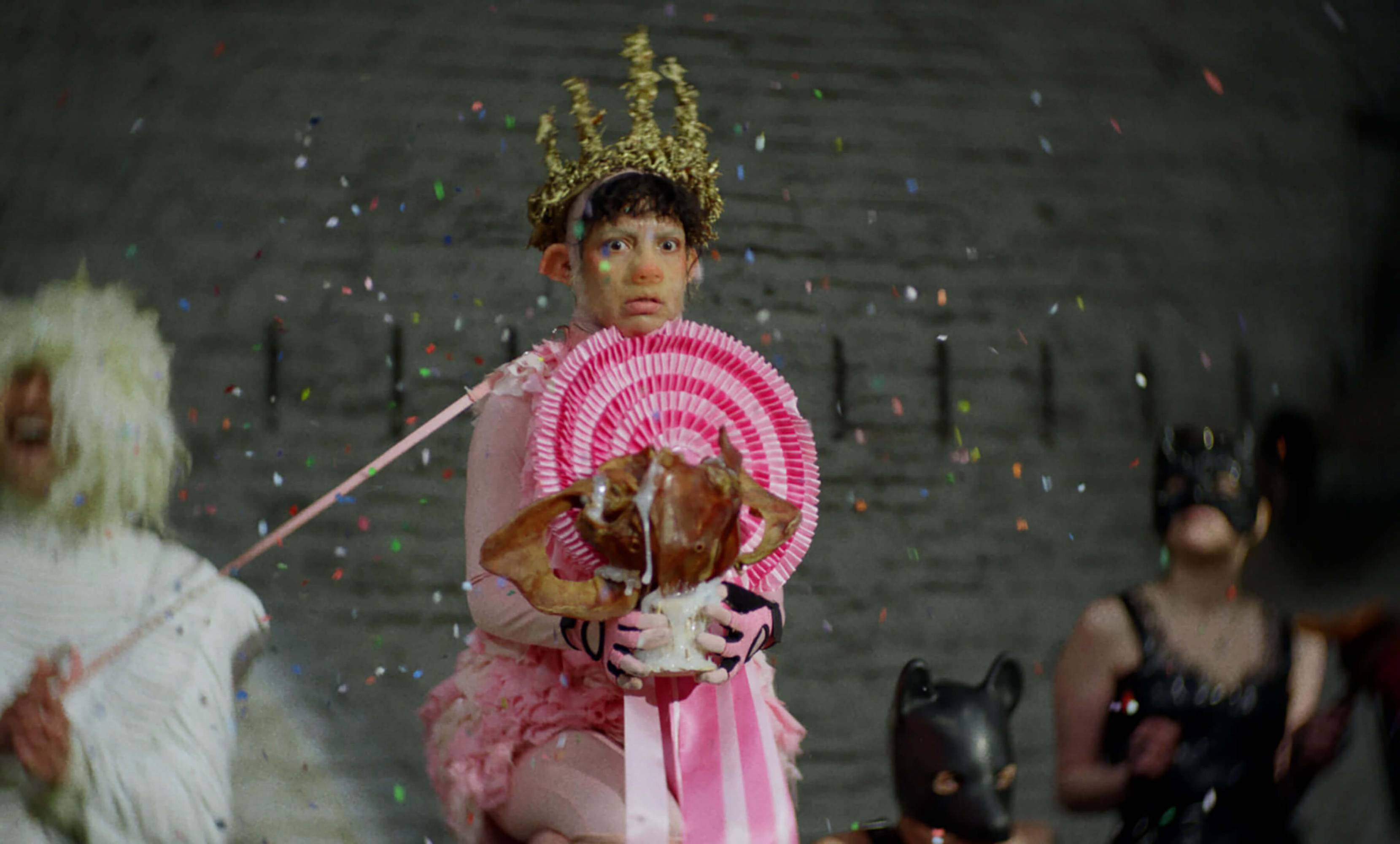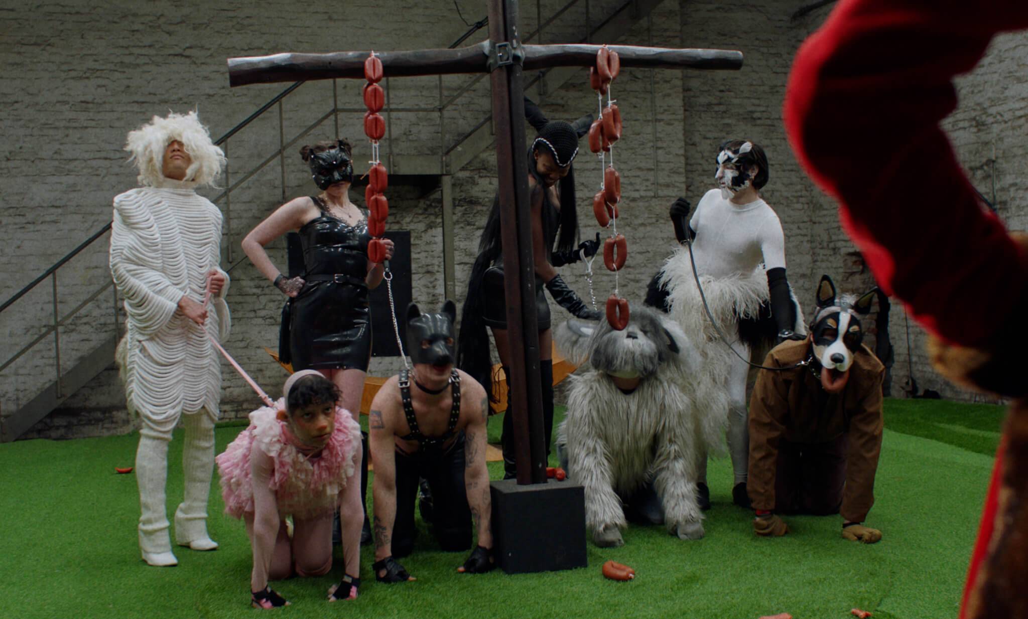 The Severed Tail follows a Piglet who embarks on a surreal journey through a fetishistic underworld after her tail has been cut off by a farmer. With a Puppy as her guide, the Piglet is subjected to a fever dream of torments—being whipped, licked, and bound into a seahorse tail. The film embraces fantasy and play as a safe space for taking possession of trauma amidst a sea of pain. To create the work, Simnett immersed herself in Pup Play and LARP communities in Berlin, with some of the people she met becoming performers in the film. The Severed Tail is shot by Robbie Ryan BSC (The Favourite, American Honey), choreographed by Kiani Del Valle, and scored by Colin Self.