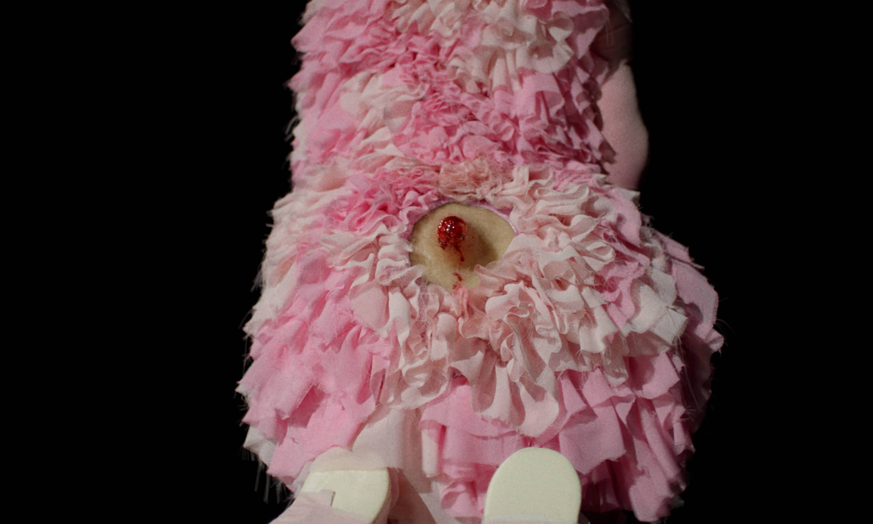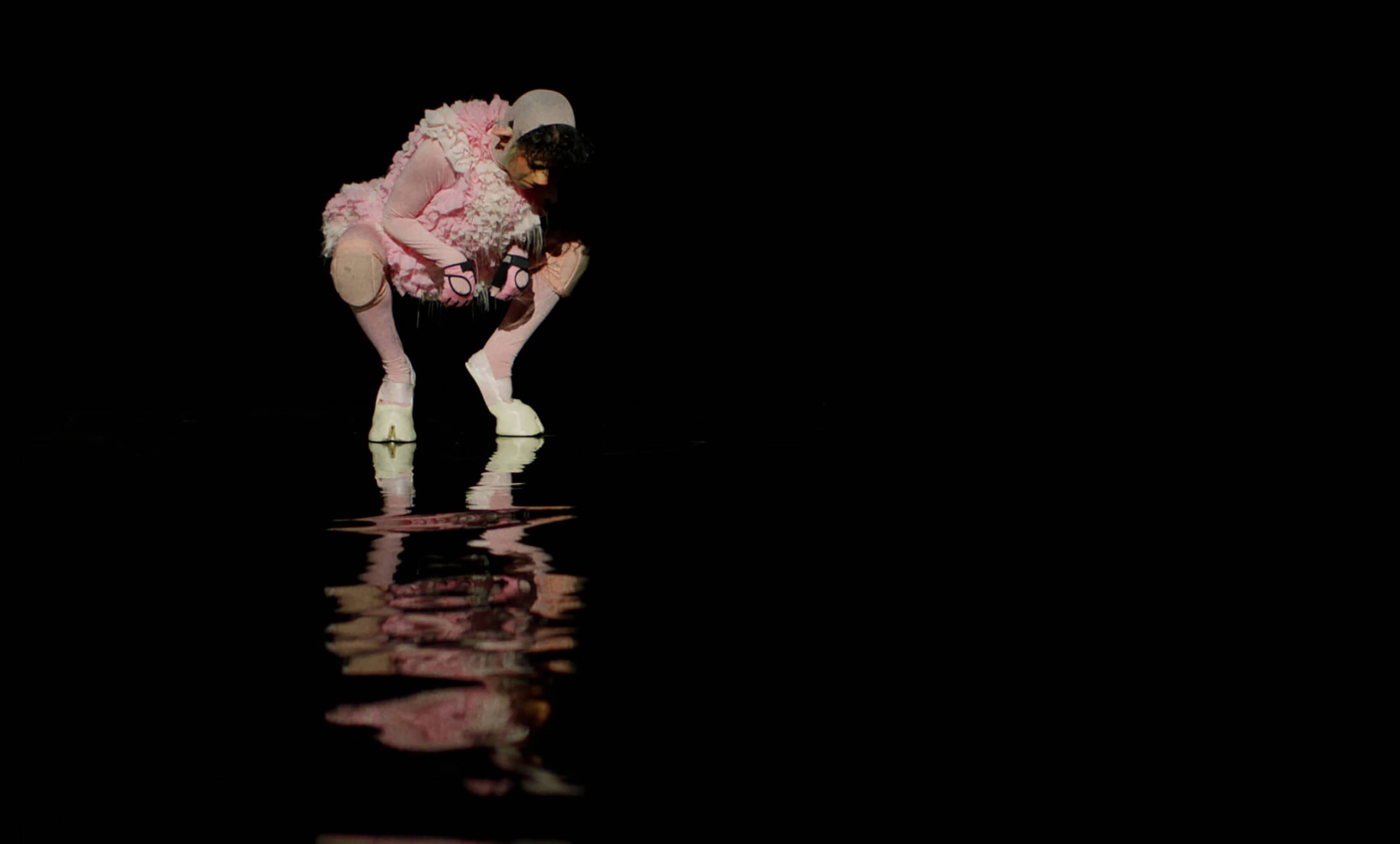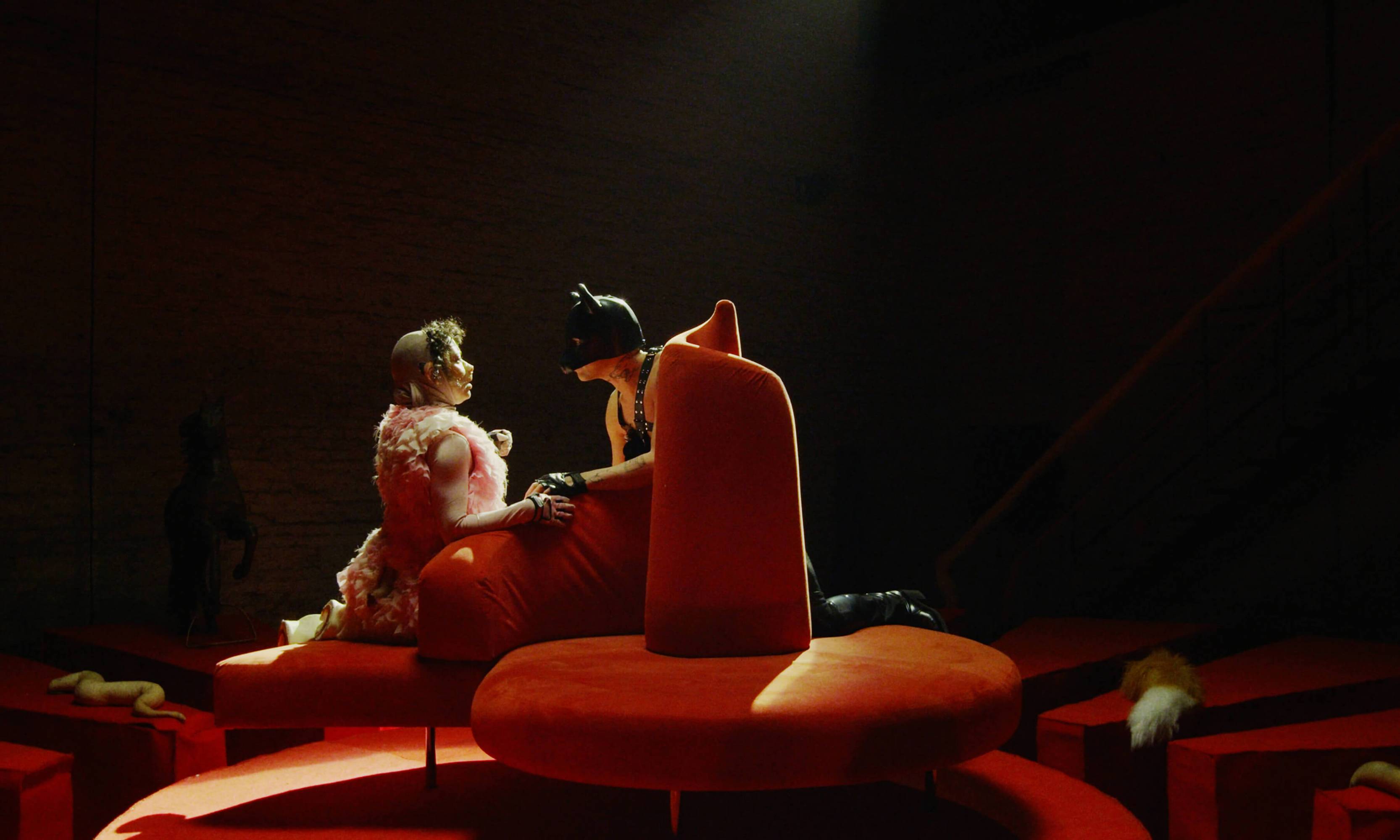 The Severed Tail follows a Piglet who embarks on a surreal journey through a fetishistic underworld after her tail has been cut off by a farmer. With a Puppy as her guide, the Piglet is subjected to a fever dream of torments—being whipped, licked, and bound into a seahorse tail. The film embraces fantasy and play as a safe space for taking possession of trauma amidst a sea of pain. To create the work, Simnett immersed herself in Pup Play and LARP communities in Berlin, with some of the people she met becoming performers in the film. The Severed Tail is shot by Robbie Ryan BSC (The Favourite, American Honey), choreographed by Kiani Del Valle, and scored by Colin Self.