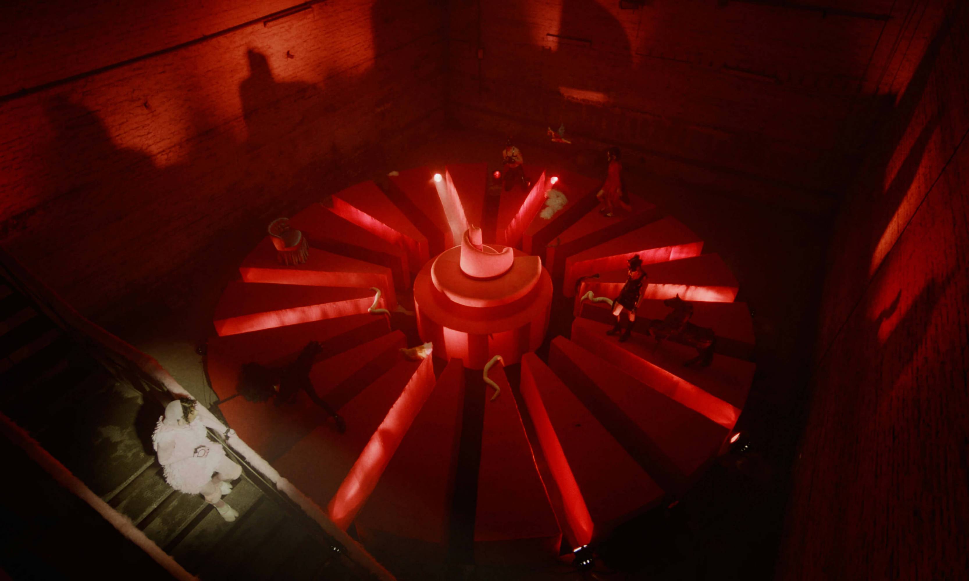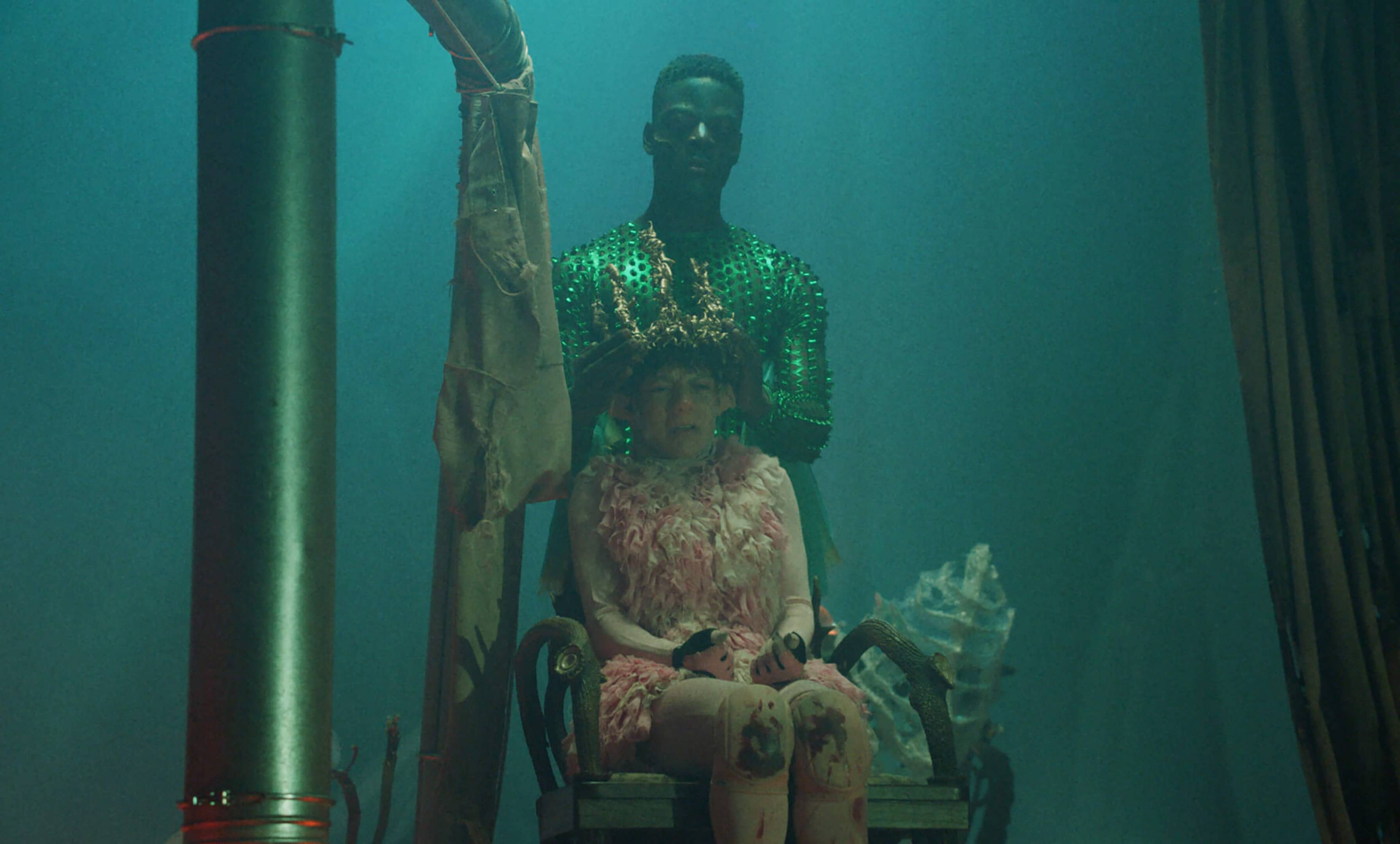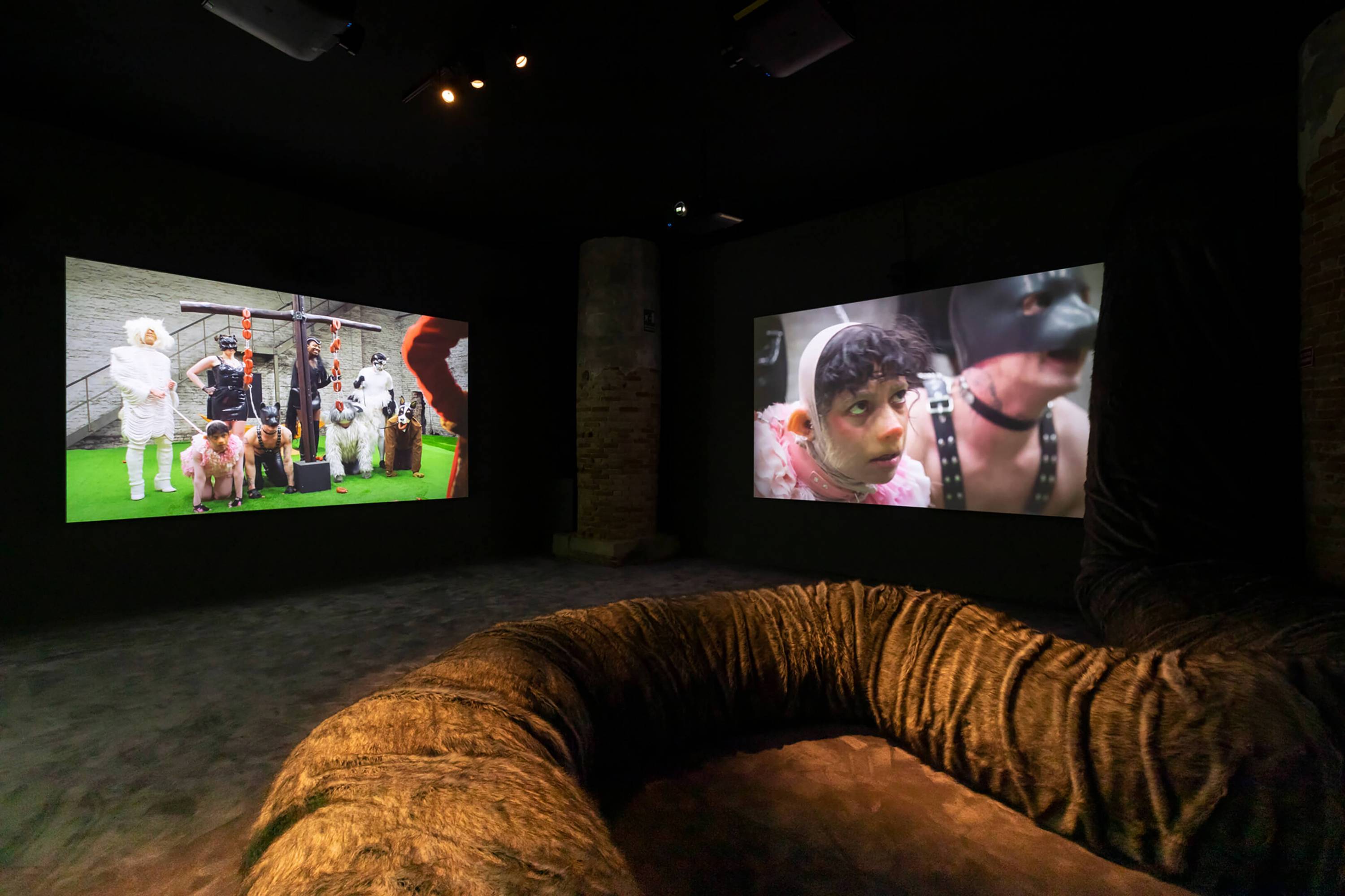 The Severed Tail follows a Piglet who embarks on a surreal journey through a fetishistic underworld after her tail has been cut off by a farmer. With a Puppy as her guide, the Piglet is subjected to a fever dream of torments—being whipped, licked, and bound into a seahorse tail. The film embraces fantasy and play as a safe space for taking possession of trauma amidst a sea of pain. To create the work, Simnett immersed herself in Pup Play and LARP communities in Berlin, with some of the people she met becoming performers in the film. The Severed Tail is shot by Robbie Ryan BSC (The Favourite, American Honey), choreographed by Kiani Del Valle, and scored by Colin Self.